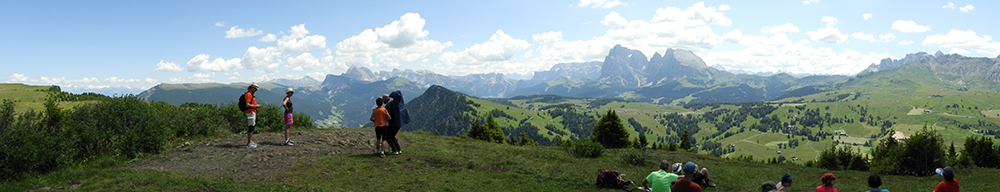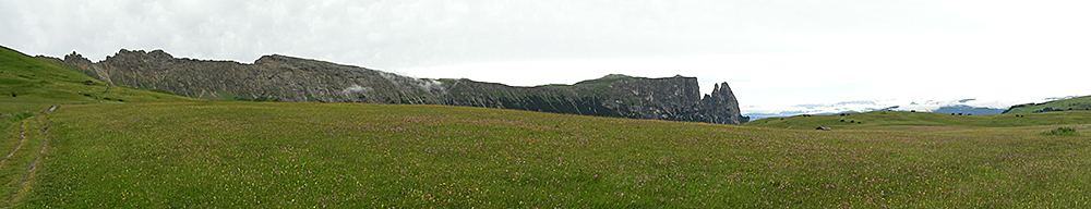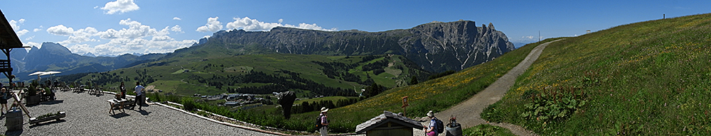 Jetzt noch einige Panorama-Bilder (jeweils von links nach rechts), die das Ausmaß der Seiser Alm und die markanten umliegenden Gebirgsmassive und Berge zeigen.