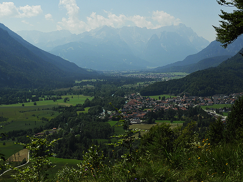 Vom Höhenrücken aus hatte man an einigen Aussichtspunkten, die zur Rast einluden, eine gute Sicht auf das breite Trogtal der Loisach und das Wettersteingebirge. Durch den Dunst konnte man die Zugspitze erahnen.