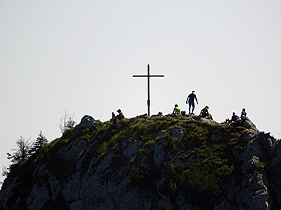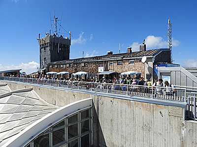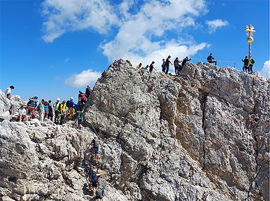 Der touristische Ansturm überrollt das Münchener Haus (oben), die älteste Berghütte auf der Zugspitze, genauso wie die letzten Meter zum Gipfelkreuz (unten). Es bilden sich lange Schlangen oft unzureichend ausgerüsteter Menschen, die dennoch den gesicherten Steig zum Kreuz unbedingt „klettern“ wollen, um ein Gipfelfoto zu machen.