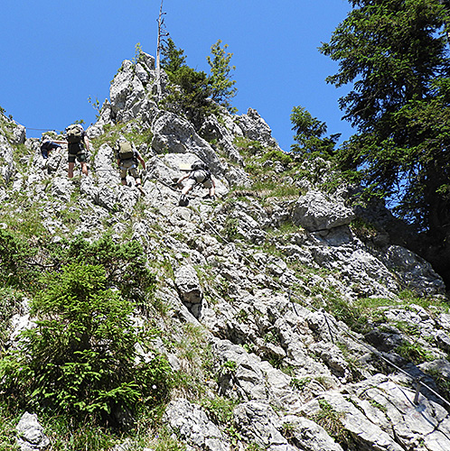 Einige sind über den Klettersteig zum nahen Ettaler Manndl gewandert. Links: Der Einstieg zum Klettersteig.