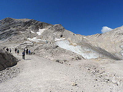 Dort angekommen, breiten sich heute nur noch Fels- und Schotterflächen aus, die im Winter als Skipisten präpariert werden. Der Schneeferner-Gletscher (links) ist nur noch in traurigen Resten vorhanden, die auch kaum zu erkennen sind, weil sie vielfach von Steinschutt überdeckt sind. Dem Höllental-Gletscher (rechts) geht es etwas besser, aber auch er ist seit Jahren auf dem Rückzug und wird den Hochferner nur um wenige Jahre überleben.