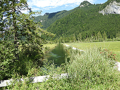 Links: Lauf der Ammer durch das Weidmoos Richtung Oberammergau.