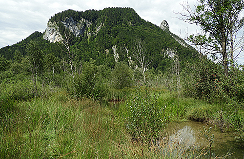 Rechts: Moorkomplex mit Blick auf Falkenwand und Kofelspitze, dem "Kleinen Matterhorn" von Oberammergau.
