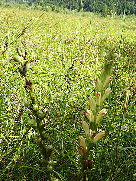 Zu den engeren Charakterarten zählen Lungen-Enzian (Gentiana pneumonanthe), Pracht-Nelke (Dianthus superbus) und das äußerst seltene Karlszepter (Pedicularis sceptrum-carolinum, Abb. links). Es hat hier sein größtes Vorkommen in Deutschland.