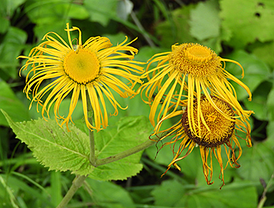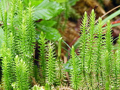 An wasserzügigen Stellen breiteten sich Rasen des Sprossenden Bärlapps (Lycopodium annotinum, unten links) aus und am Wegesrand stand die Pracht-Telekie (Telekia speciosa, unten rechts).