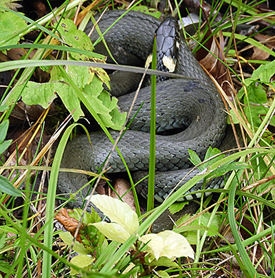 Hier fanden wir in einem feuchten Graben eine Ringelnatter (Natrix natrix, links).