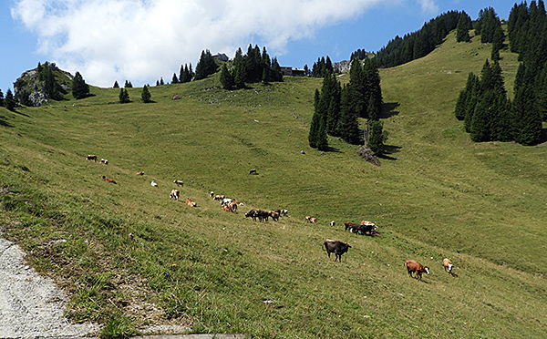 Die Kühe auf der Alm boten eine bunte Mischung verschiedener Rassen. Neben Schwarzbunte waren Anklänge von Tiroler Grauvieh, Werdenfelser, Tux-Zillertaler und andere Rassen vertreten.
