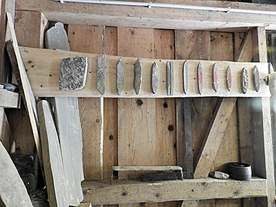 Die verschiedenen Stadien der Bearbeitung der Wetzsteine, die vor allem für die Schärfung der Sensen bei der Wiesenmahd verwendet wurden, waren auf einem Brett in der Wetzstoamacherei gezeigt.