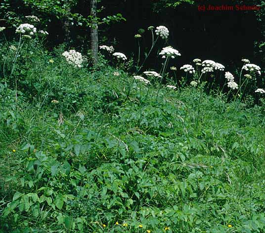 Der lückige Wald auf Kalkboden war von wärmeliebenden Staudensäumen geprägt. Typische Arten sind das rechts abgebildete Laserkraut (Laserpitium latifolium), Berg-Haarstrang (Peucedanum oreoselinum), Salomonssiegel oder Echte Weißwurz (Polygonatum odoratum) und Ästige Graslilie (Anthericum ramosum).
