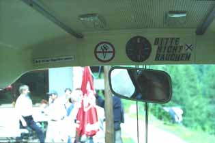 | Das letzte Bild ist dem wichtigsten Mann der Exkursion gewidmet. Es zeigt den Arbeitsplatz unseres Busfahrers, dem Müller Sepp. Mit traumhafter Sicherheit lenkte er den Bus über die schmalsten Bergsträßchen. Dabei eröffneten sich immer wieder atemberaubende Ausblicke, die allerdings von den nervenschwächeren Exkursionsteilnehmern nicht immer als Genuss empfunden wurden. |