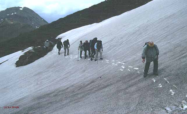 In den ersten Tagen war das Wetter noch sehr gemischt. Die erste Tour begann noch bei schönem Wetter, aber die Schneefelder gingen noch recht weit hinab. Dann kam auch noch Nebel und Nieselregen hinzu, so dass sich die Gruppe zur Umkehr entschloss.