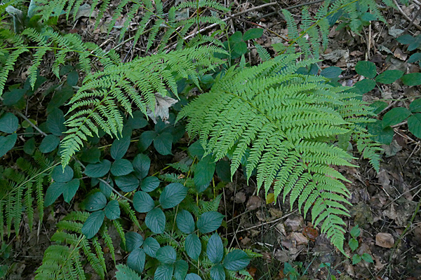 Oben und links ist der Breitblättrige Dornfarn (Dryopteris dilatata) abgebildet. Die Wedel -wie man bei Farnen die Blätter nennt- sind 3-4fach zerteilt. Die Spreuschuppen an der Basis der Wedel sind Auswüchse der Haut, also keine Blätter. Beim Breitblättrigen Dornfarn sind sie zahlreich und mit dunklem Zentrum. Beim Gewöhnlichen Dornfarn (D. carthusiana) (s. unten) sind sie heller und gleichmäßig durchscheinend.