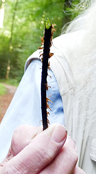 Zum Schluss wurde überraschend noch ein weiterer Farn gefunden, wegen des ungünstigen Standorts in einem Fichtenforst allerdings nur in einem sehr mickrigen Exemplar. Beim Adlerfarn (Pteridium aquilinum) stehen die Wedel nicht in Rosetten sondern entspringen einzeln einem kriechenden Rhizom. Sie wachsen senkrecht hervor, so dass Laien das leicht für einen Spross mit seitlichen Blättern halten. Was links zu sehen ist, ist aber nur ein einziger Wedel.