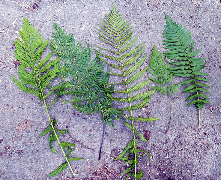 Alle Arten im Vergleich, v.l.n.r.: Frauenfarn, Breitblättriger Dornfarn, Gewöhnlicher Wurmfarn, Gew. Dornfarn, Borrers Schuppen-Wurmfarn.