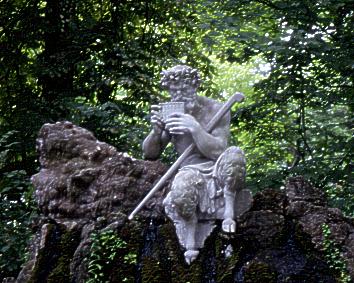 Pan, der Flöte spielende Hirtengott Arkadiens, in einer Seitennische des Parks in Schwetzingen. |