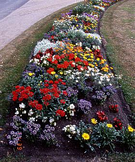 Die Blumenrabatten im Würzbürger Residenzgarten sind nach den Vorgaben barocker Fachliteratur artenreich mit einer nach Farbe und Höhe gegliederten Mischung von Frühjahrs- und Sommerblumen bepflanzt.