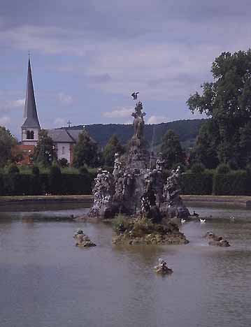 Oben: Fürstbischof Adam Friedrich von Seinsheim ließ im Garten auf spielerische Weise seine Weltsicht gestalten im Spannungsfeld von Gut und Böse, Erlösung und Verdammnis, Tod und Leben.