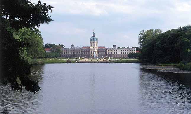 Blick aus dem Park über den großen Karpfenteich auf die Gartenseite des Schlosses Charlottenburg