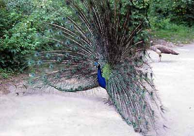 Die exotischen Hühnervögel haben die der im Wannsee gelegenen Pfaueninseln den Namen gegeben; rechts das Lustschloss auf der Insel.