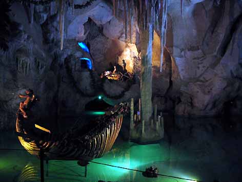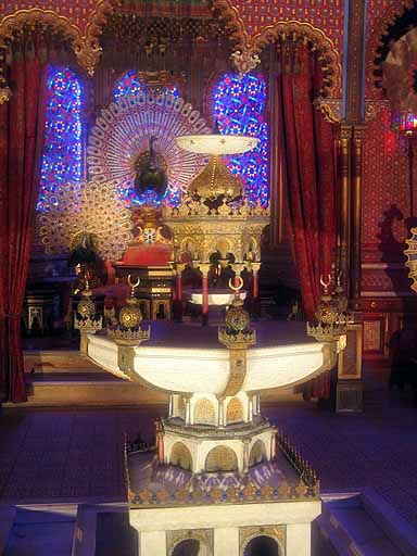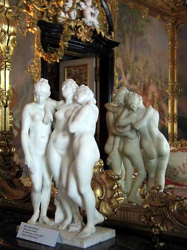 Die Grazien (links) stammen aus der Einrichtung des Schlosses. Die Grotte(links unten) ließ Ludwig zum Schwanensee ausbauen, damit sie als Kulisse für Aufführungen von Wagners Oper Lohengrin dienen konnte. Der berühmte Pfauenthron (rechts unten) ist im Maurischen Kiosk im Schlosspark von Linderhof untergebracht.