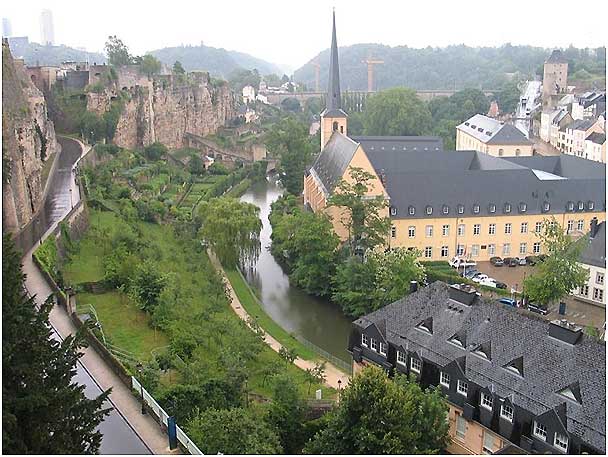 Am busfreien Tag in Luxemburg hatten wir eine Stadtführung mit einem Besuch der Kasematten des Bockfelsens (im Bild links), auf dem 963 Graf Sigfried die erste Burg errichtete und damit die heutige Stadt Luxemburg gründete. Der Fluss ist die Alzette und das Kloster Neumünster. Der Stadtteil, in dem entlang der Alzette auch einige schöne Gärten liegen, nennt sich Grund. Die nur schwach zu erkennenden Hochhäuser links oben im Bild gehören zum Plateau Kirchberg, einem völlig neuen Stadtteil, in dem sich die europäischen Einrichtungen, Banken und andere Geschäftshochhäuser konzentrieren.