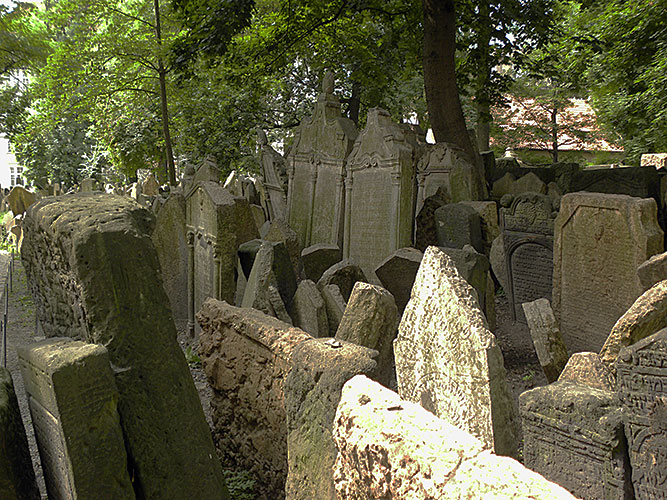 Links: Besuch der Josefstadt, des alten jüdischen Viertels von Prag, mit dem jüdischen Friedhof, auf dem auch der Gelehrte, Rabbi Loew (Erfinder der Legende des Golems), beerdigt ist.