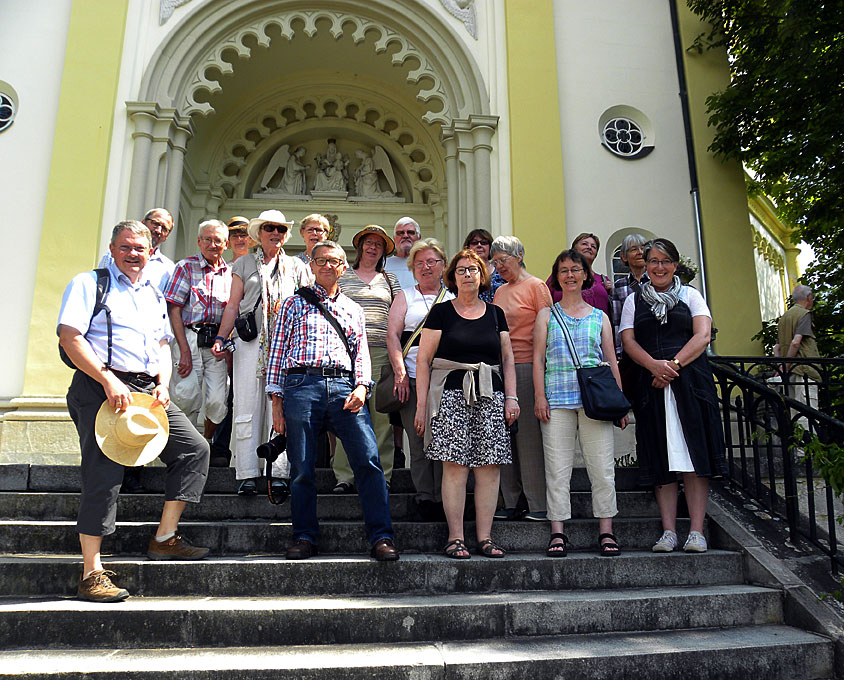 Nach den sehr intensiven und mit barocker Hochkultur im wahrsten Sinne des Wortes „überladenen“ Tagen in Dresden und Prag waren die Teilnehmer froh, die sehr erholsame Landschaft des Böhmerwalds und die gemächliche Ruhe und Erholung des Kurbetriebs in Marienbad und Franzensbad zu genießen. Gruppenbild vor der Kirche Maria Himmelfahrt in Marienbad
