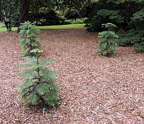 Rechts sind Nachzuchten von Wollemia nobilis zu sehen. Diese Art wurde erst 1994 in Australien entdeckt und war bis dahin nur als viele Millionen Jahre altes Fossil bekannt. Die monotypische Gattung (einzige Art) aus der Familie der Araukariengewächse ist zu Ehren des Entdeckers David Noble benannt.