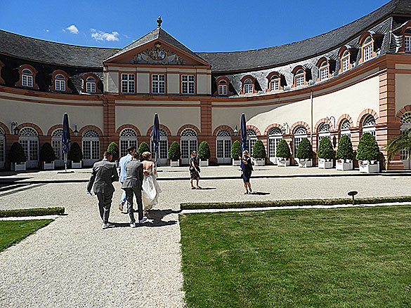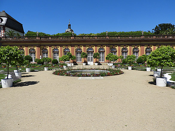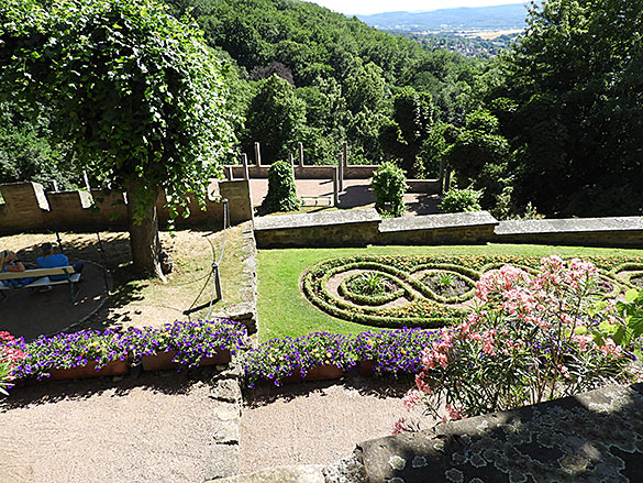 Oben links ist die erste Orangerie zu sehen, die sehr früh auch als Festsaal genutzt wurde und rechts die zweite Orangerie, deren Dach als Terrasse ausgebaut ist. Auf mehreren Terrassen sind Blumen und Gemüseparterres angelegt. Das Schloss thront auf einem Bergsporn oberhalb der Lahn.