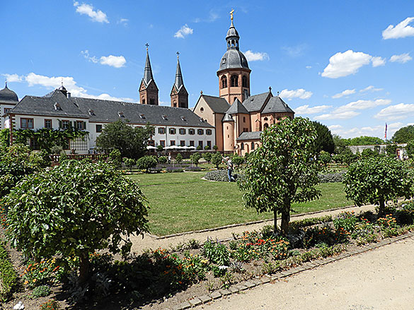 Kloster Seligenstadt ist eine der wenigen vollständig erhaltenen Anlagen in Hessen. Einhard, der Biograph Karls des Großen, erbaute um 840 die Klosteranlage, die den Namen „Seligenstadt“ erhielt. Vermutlich lieferte der St. Galler Klosterplan das Vorbild. Es war als eigenständige kleine Stadt organisiert. Wirtschaftsgebäude, Höfe und Gärten, durch eine hohe Mauer vom weltlichen Geschehen abgetrennt, umgeben Kirche und Kloster. Plünderungen und Verwüstungen während des Dreißigjährigen Krieges brachten das Klosterleben fast zum Erliegen. Ab 1685 erfolgte der Neuaufbau mit den Gebäuden und den Gärten in der heute noch erhaltenen Form.