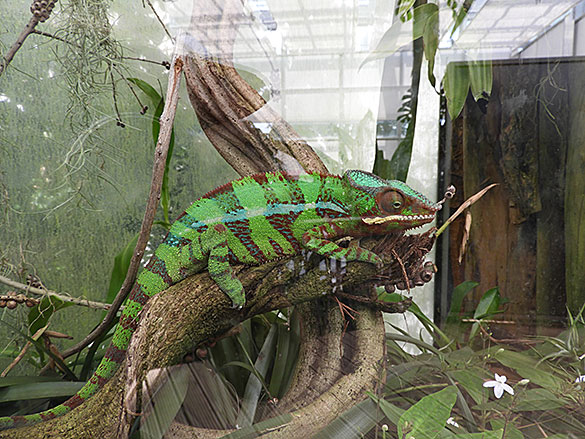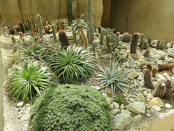 Oben links: Piet Oudolf Beet; oben rechts: Dankil, Wüsten- und Urwald-Haus; unten links: Sukkulente Wüstenpflanzen; unten rechts: ein urwaldbewohnendes Chamäleon.