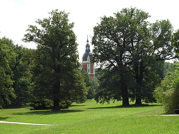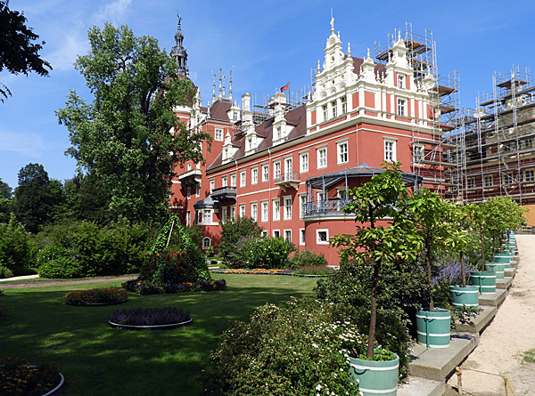 Auf dem Weg zurück besuchten wir den Pückler-Park in Muskau. Das Schloss ist in den 1990ziger Jahren wieder aufgebaut worden und schon wieder in Teilen renovierungsbedürftig. Der Park ist öffentlich zugänglich. Er ist als Weltkulturerbe anerkannt, erstreckt sich beiderseits der Neiße in Deutschland und Polen und ist ein gelungenes Beispiel für die freundschaftliche deutsch-polnische Zusammenarbeit.
