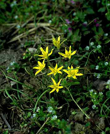 An der folgenden Wegböschung wurde blühend angetroffen: Hungerblümchen (Erophila verna ssp. verna), Hain-Ehrenpreis (Veronica hederifolia ssp. lucorum), Raues Veilchen (Viola hirta), Frühlings-Fingerkraut (Potentilla tabernaemontani) und als Besonderheit den Acker-Gelbstern (Gagea villosa) (Abb. rechts). Dieses wärmeliebende Liliengewächs ist in der Nordeifel sehr selten.