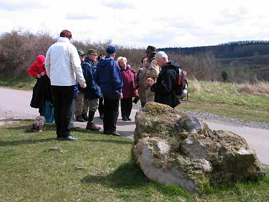 Mit halbstündiger Verspätung (ein Teilnehmer hatte sich verfahren) ging es zum Antoniushäuschen. Hier gab es eine kurze Einführung in die Geologie (Abb. links).