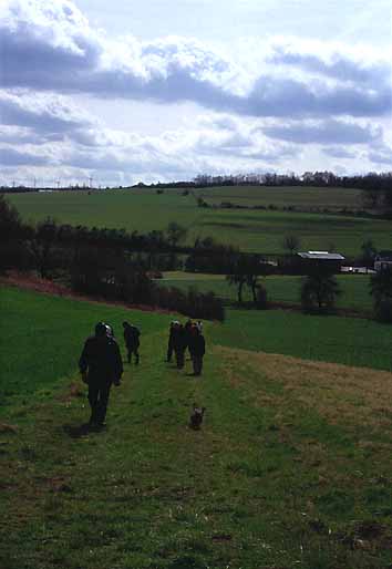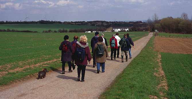 Die Wandergruppe kurz vor Thuir. Im Hintergrund in Bildmitte sind die von Buschwerk eingerahmten Hänge des Biesbergs zu sehen.