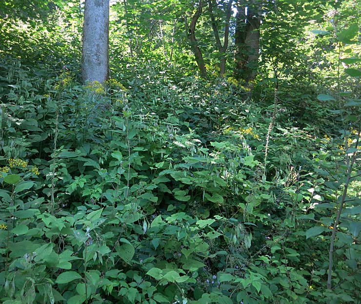 Herausragend ist das Massenvorkommen der Ausdauernden Mondviole (Lunaria rediviva). Bis auf wenige Nachzügler war die Blühphase vorbei, aber die auffälligen, großen Früchte waren schon gut entwickelt (Abb. rechts). An typischen Bäumen wurden Esche, Berg-Ahorn und die seltene Berg-Ulme demonstriert.