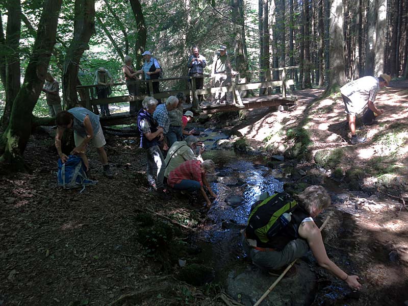 Durch das Kluckbachtal wurde dann die Rur erreicht. Kurz vor der Mündung konnte man im Kluckbach die Wasserfauna untersuchen. Neben Kleinkrebsen entdeckten die Teilnehmer viele verlassene Köcher von Köcherfliegenlarven. Das ist typisch für saubere, kühle Mittelgebirgsbäche.