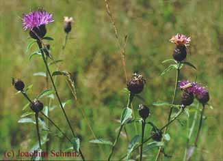 Auf den Wiesen gab es einige, inzwischen durch die Intensivierung der Landwirtschaft selten gewordene Blumen zu entdecken wie den Großen Wiesenknopf (Sanguisorba officinalis) oder die für das Monschauer Land und das Hohe Venn besonders typische Schwarze Flockenblume (Centaurea nigra ssp. nigra) (Abb. unten).
