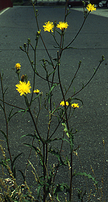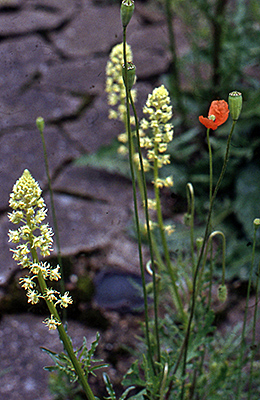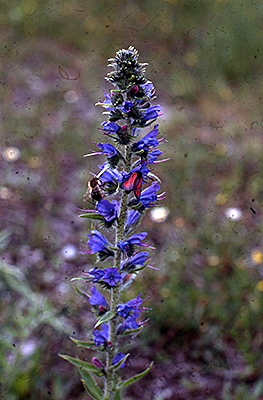 Dagegen halten sich großflächig ruderale Staudenfluren, die vor allem dem Dauco-Picridetum zuzuordnen sind, also der Möhren-Bitterkrautflur. Möhren waren vermutlich wegen der vorausgegangenen Trockenperiode nur spärlich und mickrig anzutreffen, nicht so das Bitterkraut (Picris hieracioides, Abb. unten links). Das Dauco-Picridetum ist die Zentralassoziation des Verbandes Dauco-Melilotion, d.h. sie weist jetzt keine spezielleren Charakterarten auf. Typisch für sandig-steinige Böden ist allerdings der Natternkopf (Echium vulgare, Abb. links). Im gleichen Sinne ist das Vorkommen der Wilden Resede (Reseda lutea, Abb. unten rechts) einzuordnen.
