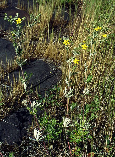 Auf dem Plateau wachsen auch Sand- und Felsrasen. Typische Arten wie Mäuseschwanz-Federschwingel (Vulpia myuros) und Nelken-Haferschmiele (Aira caryophyllea) waren allerdings nur noch als braunes Heu anzutreffen. Bemerkenswert ist das Vorkommen des Silber-Fingerkrauts (Potentilla argentea) (links). In der Eifel ist die Art nichts Besonderes, in der Niederrheinischen Bucht ist sie aber ziemlich selten.