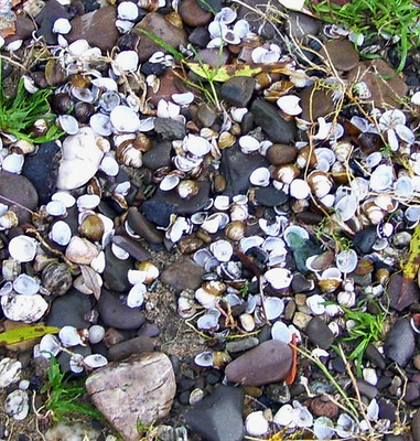 Vor einigen Wochen war an dieser Stelle die Rede von eingeschleppten Pflanzen am Rhein. Mindestens so große Umwälzungen hat es durch eingeschleppte Tiere, sogenannte Neozoën, gegeben. Wassertiere im Rhein bekommt ein Laie kaum einmal zu sehen. Was man aber leicht finden kann, sind angeschwemmte Hartteile am Ufer, vor allem Muschelschalen.