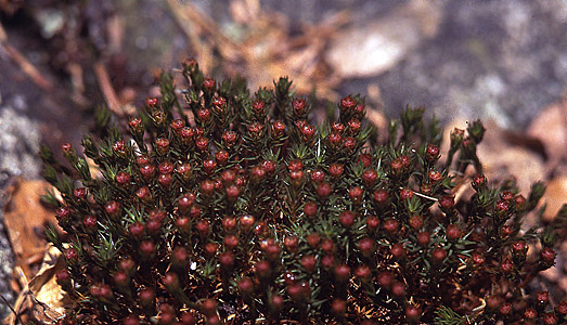 Die Gametangienstände sind sehr klein und meistens auch sehr unscheinbar und werden nur von Fachleuten erkannt. Es gibt allerdings Ausnahmen. In der Gattung Polytrichum (Frauenhaarmoos/Widertonmoos) sind die Gametangien von auffällig verbreiterten Blättern umgeben. Meistens sind die auch irgendwie grünlich. Beim Glashaar-Widertonmoos (Polytrichum piliferum) sind diese Blätterkelche auffällig rot gefärbt und damit unverkennbar (siehe Foto).