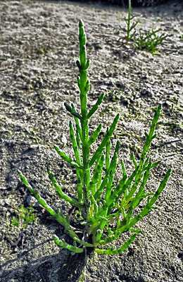 Normalerweise trifft man diese bis 30 cm hoch wachsende Pflanze mit dem deutschen Namen Queller nicht im Raum Aachen an. Sie braucht Salz- beziehungsweise Meerwasser zum Leben und die Zeiten, wo sich hier ein Meer befunden hat, sind nun mal sehr lange vorbei. So wächst diese Pflanze in der Regel nur entlang der Meeresküsten in Höhe oder unterhalb der Tidehochwasserlinie, im Wattenmeer, in Salzmarschen und an Ufern von Salzseen. Ohne einen bestimmten Salzgehalt und eine Wassersättigung des Bodens (meist Schlick oder Sand) kann sie nicht existieren. Sie gehört zu den obligaten Halophyten (Salzpflanzen, bei denen Salz Pflicht ist) und ist in entsprechenden Bereichen der Nordhalbkugel und in Südafrika verbreitet. Die bekanntesten Standorte in Deutschland sind im friesischen Naturpark Wattenmeer. Sie ist eine Pionierpflanze der Verlandungszonen und hat eine große Bedeutung hinsichtlich der Sedimentation von Schwebstoffen. „Und trotzdem“ auch bei uns ist sie hin und wieder zu sehen: Ihre dicken, wasserspeichernden, sukkulenten Stängel mit kleinen, kaum zu sehenden schuppenförmigen Blättern, die die Achsen einschneiden und die Pflanze aussehen lassen wie kleine Säulenkakteen, sind immer wieder mal in den Auslagen von Fischabteilungen beziehungsweise von Fischgeschäften unter ihrem lateinischen Gattungsnamen „Salicornia“ zu finden. Als Gemüsebeilage mit dem edlen Namen „Meeresspargel“ ist sie gedacht zu Fischgerichten, zum „Salzwiesenlamm“ oder als Salat roh oder auch gedünstet. Ihr Geschmack salzig, mit einer pfeffrigen Note!