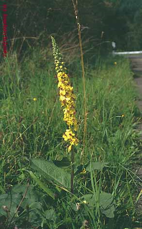 Die Pflanzengattung der Königskerzen (Verbascum) mit ihren etwa dreihundert Arten gehört zur Familie der Braunwurzgewächse (Scrophulariaceae) und ist in Europa, Asien und Nordafrika weit verbreitet. Im Rheinland findet man häufig Verbascum densiflorum (Großblütige Königskerze), V. nigrum (Schwarze K.) sowie V. lychnitis (Mehlige K.). Aus dem Samen entwickelt sich im ersten Jahr eine grundständige, oft filzig behaarte Blattrosette. Daraus treibt im zweiten Jahr ein wechselständig belaubter Spross, dessen Spitze in ährigen, rispigen oder traubigen Blütenständen dicht mit gelben, nur bei V. phoeniceum mit violetten Blüten besetzt ist. Die fünf Blütenkronblätter sind am Grund verwachsen, die Staubfäden meist wollig behaart. Mit ihrem üppigen Pollenangebot lockt sie von Juni bis September zahlreiche Insekten an, die die vielen Blüten bestäuben und so bis zu sechshunderttausend Samen pro Pflanze entstehen lassen.