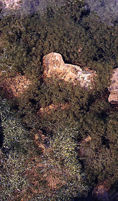 Algenrasen in einem Steinbruch in Stolberg (Rheinland), vorne die größere Gemeine (Chara vulgaris), hinten die Raue Armleuchteralge (Ch. aspera).
