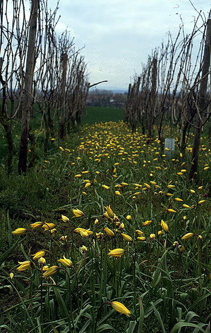 Eine Tulpe hat es allerdings schon früher in Mitteleuropa gegeben. Sie ist wohl nicht, wie das in manchen Quellen vermutet wurde, mit den Römern zu uns gelangt. Gesichert sind Belege, dass sie im 16. Jahrhundert als Zierpflanze nach Mitteleuropa kam. Sie muss aber dann sehr leicht verwildert sein. Vor allem in Weinbergen hat die Art ein Ersatzbiotop gefunden. Als Linné die Art 200 Jahre später benannt hat, war die Art so geläufig, dass er sie Wilde Tulpe (Tulipa sylvestris) genannt hat. Weinberge werden ökologisch zu den Hackfruchtäckern gezählt. Im Gegensatz zu Getreideäckern, die, einmal gesät, bis zur Ernte meistens nicht weiter bearbeitet werden, müssen Hackfruchtäcker mehrfach von Wildkräutern befreit werden. Früher geschah das durch Hacken. Heute wird das oft nur noch durch den Einsatz von Herbiziden bewerkstelligt, also chemischen Unkrautvernichtern.