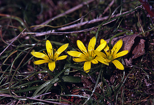 Eine der wenigen auffälligen Blütenpflanzen ist der Felsen-Goldstern (Gagea bohemica), ein Liliengewächs, das botanisch auch nach den vielen Umstellungen der vergangenen Jahre bei den Liliengewächsen im strengsten Sinne geblieben ist. Um den Felsen-Goldstern zu sehen, muss man allerdings schon ziemlich weit nach Süden fahren. Die nördlichsten Vorkommen befinden sich auf ein paar Felsen an der Untermosel zwischen Cochem und Treis-Karden. Anscheinend ist die Art nicht einmal besonders trittempfindlich; sie kommt auch unmittelbar um die Wanderhütten vor, von denen man an der Untermosel die Aussicht genießen kann. Offensichtlich sind nur die klimatischen Ansprüche entscheidend. Auch der Felsen-Goldstern begründet eine eigene Gesellschaft, die allerdings eher kontinental verbreitet ist und an der Mosel den Nordwestrand seiner Verbreitung erreicht.