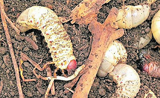 Hirschkäferlarven in einem mit Holz gefüllten Hochbeet.