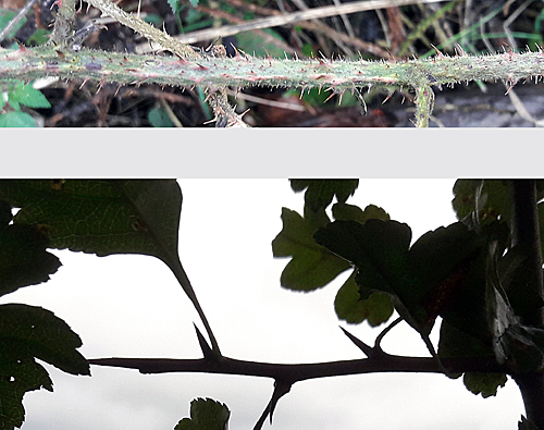 Brombeere mit Stacheln (oben) und Weißdorn mit Sprossdornen
