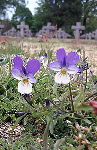 Dünen-Stiefmütterchen wachsen in Lommel zwischen den Grabkreuzen.